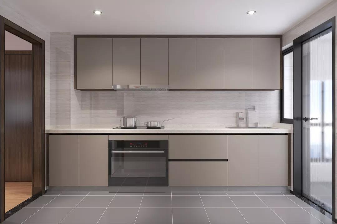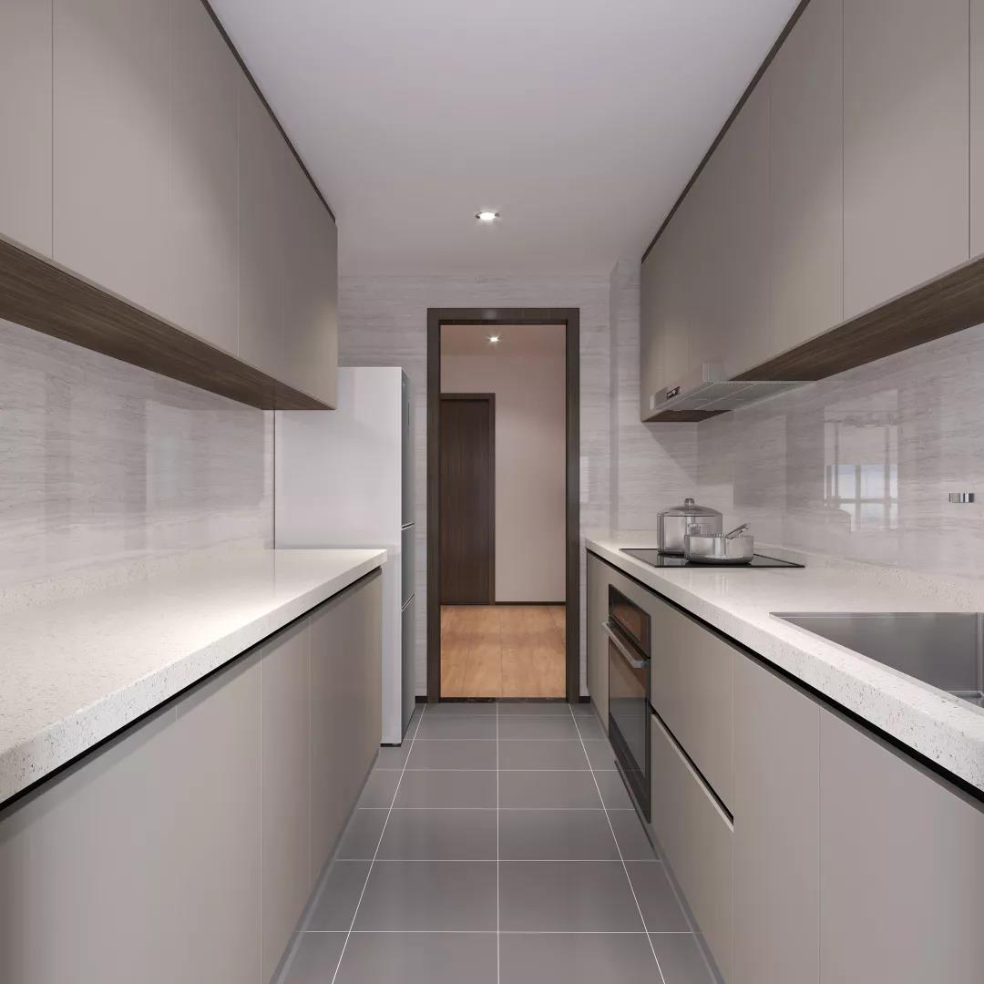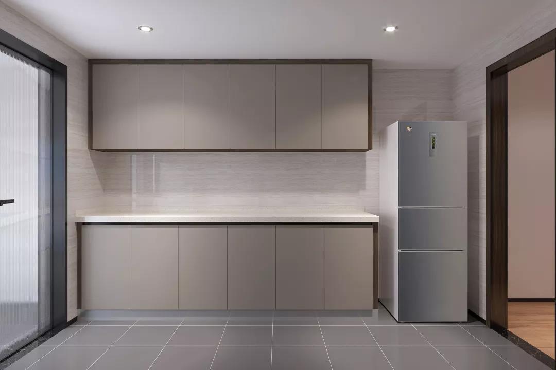 厨房的设计选材和色彩搭配上,注重实用美观与颜值并存法。柜门造型颜色及灰色台面的搭配出经典,用心生活也要懂得享受方寸间。