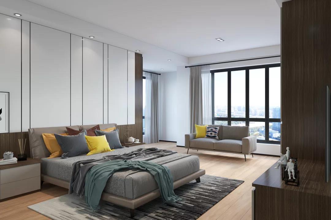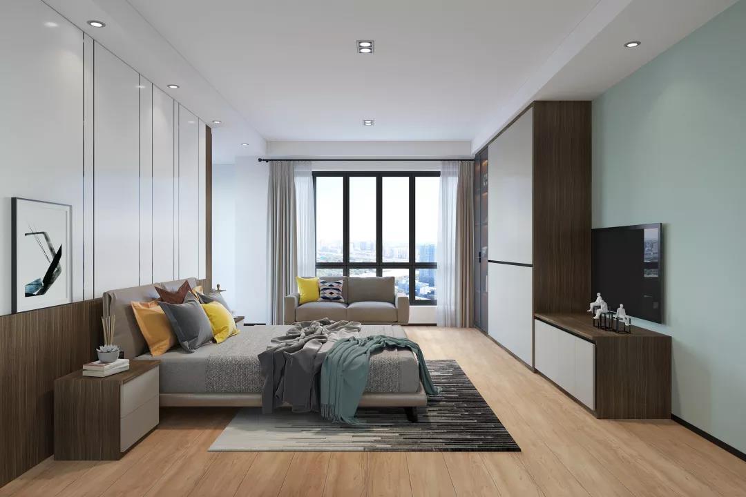 主卧空间非常宽敞。床头墙面与大衣柜的花色相衬,干净统一。置顶的大衣柜紧靠电视柜,线条简单,衣柜的设计也非常简单。靠墙处设计了可视的空间,而封闭式的分上下两层,保留足够的储存空间非常贴心。