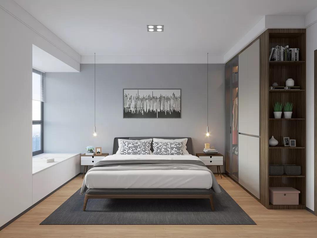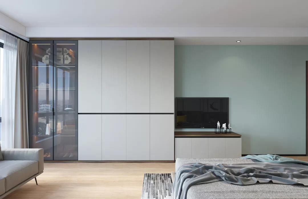 次卧虽然没有主卧开敞,但是衣柜的存储空间却显得更加充足。在衣柜与门的转角处还被巧妙地利用起来当展示区,非常有设计感。