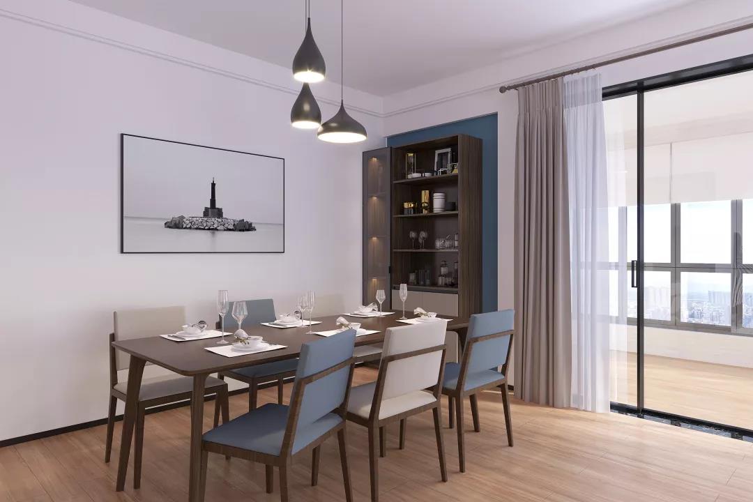 用餐厅采用暖蓝色调点缀,与客厅空间相呼应。不仅温馨,还显得格外别致。让用餐时间都慢下来,能够用心地去享用一家人坐在一起吃饭的欢愉。