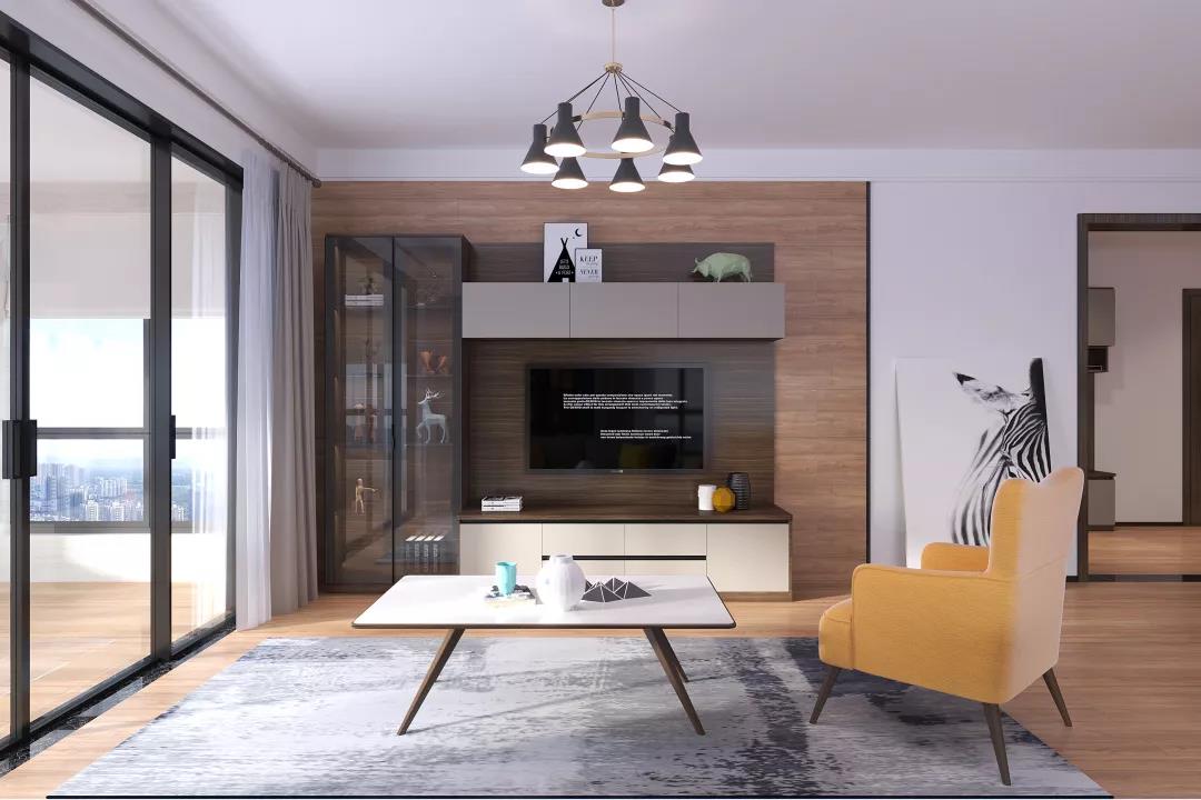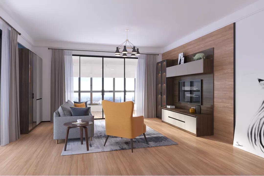 犹如璀璨的金秋,客厅空间里的木色显得格外清新,感觉融入了大自然。电视柜简洁大气,侧边的柜体用棕色玻璃掩门装饰,内置LED灯,与墙面和柜体混为一体,十分惬意。